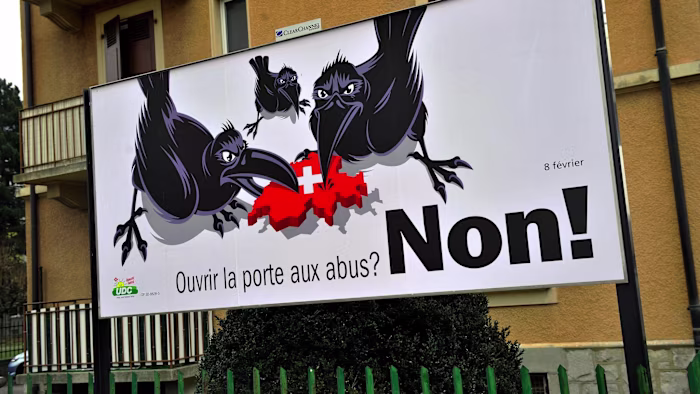 Elle représente des moutons blancs expulsant un mouton noir du territoire suisse. Cette image est devenue l’un des exemples les plus connus de la radicalisation visuelle du discours politique sur l’immigration en Europe.